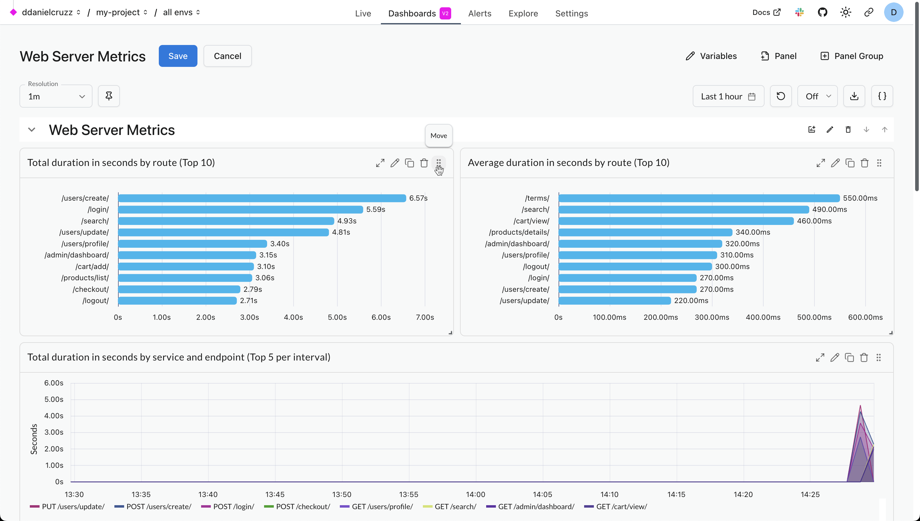 This dashboard gives an overview of how long each of your web server endpoints takes to respond to requests and how often they succeed and fail. It relies on the standard OpenTelemetry http.server.duration/http.server.request.duration metric which is collected by many instrumentation libraries, including those for FastAPI, Flask, Django, ASGI, and WSGI. The charts give a breakdown by endpoint (and sometimes status code) both overall and over time. Hover over each time series to see the most impactful endpoint at the top of the tooltip. The charts show: