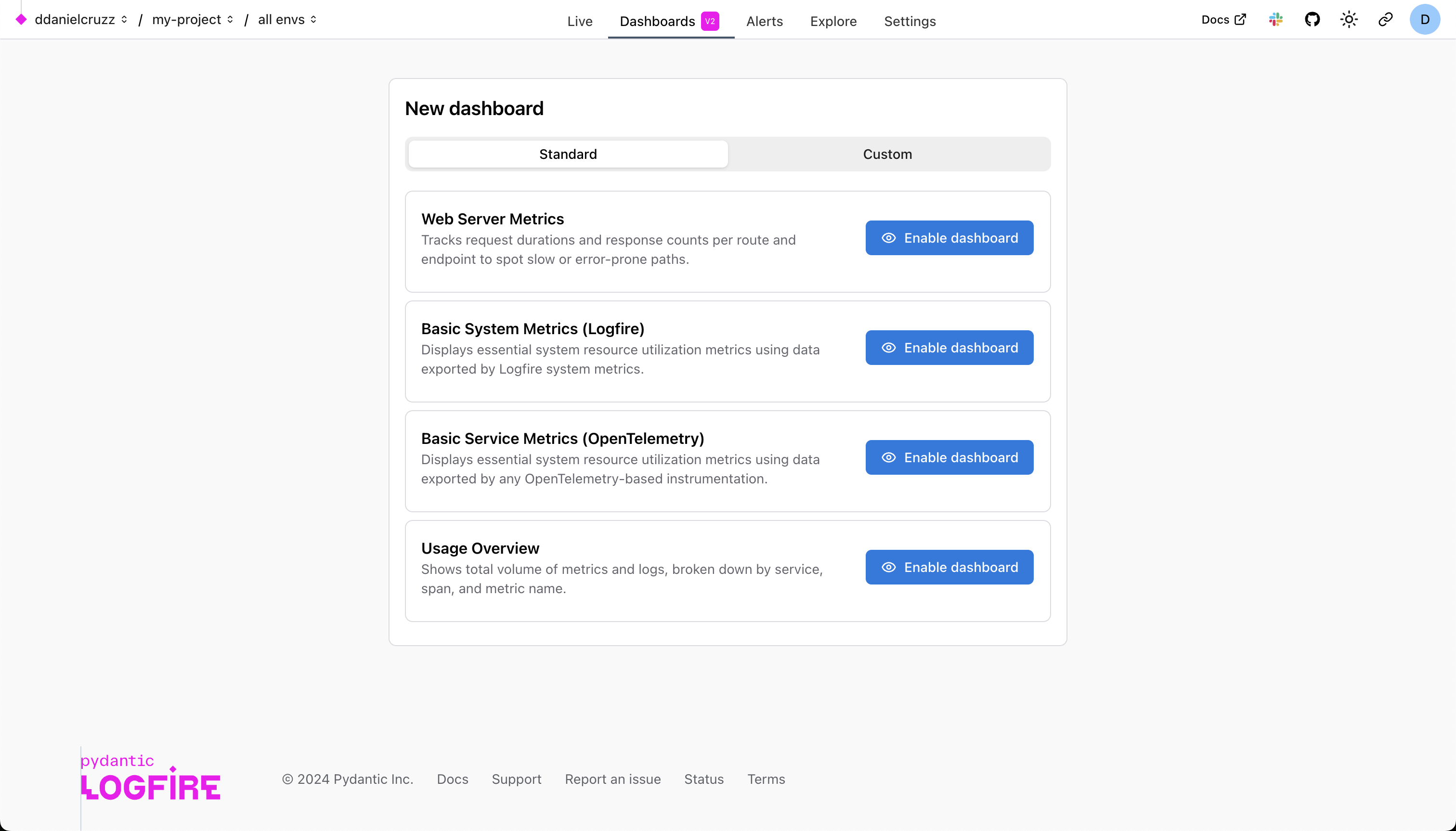 • Standard dashboards: Pre-configured dashboards created and maintained by the Logfire team, providing you with continuous updates and improvements without any effort on your part. You can enable or disable them for your project, but you can't modify them directly.