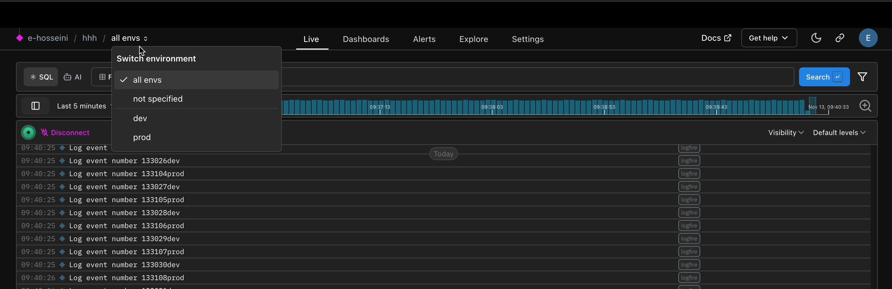 Any environments you create via the SDK will appear below the system generated environments. When you select an environment, all subsequent queries (e.g. on live view, dashboards or explore) will filter by that environment.